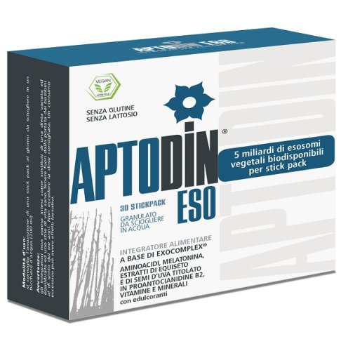 APTODIN ESO contiene: Exocomplex, 5 miliardi di esosomi vegetali; aminoacidi: L-cistina, L-metionina, L-arginina (costituenti della cheratina presente nella struttura dei capelli) e taurina; melatonina; equiseto utile per il benessere dei capelli e delle unghie; estratto di semi d’uva, antiossidante, titolato in proantocianidine B2; vitamina B6 contribuisce alla regolazione dell’attività ormonale; vitamina B5 contribuisce al normale metabolismo degli ormoni steroidei; zinco e selenio contribuiscono al mantenimento di unghie sane e con la biotina al mantenimento dei capelli normali; il ferro contribuisce alla protezione delle cellule dallo stress ossidativo e alla normale funzione del sistema immunitario.