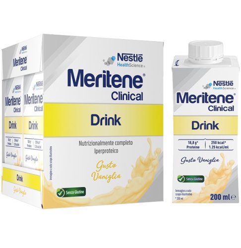 Alimento a fini medici speciali. Nutrizionalmente completo. Iperproteico. MERITENE Clinical Drink è un alimento a fini medici speciali, caratterizzato da un elevato contenuto proteico e di carboidrati. Per questo motivo è indicato per la gestione dietetica della malnutrizione calorico-proteica, anche di pazienti sarcopenici.