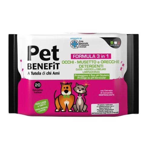 Le salviette detergenti PET BENEFIT, studiate per l’igiene quotidiana di occhi, musetto e orecchie di cani e gatti, sono ideali per rimuovere polvere, secrezioni ed impurità nel rispetto del pH iso-oculare e per non creare irritazioni né arrossamenti durante l'uso. La loro formulazione prettamente detergente è stata arricchita con estratto di camomilla, dall’azione rinfrescante e delicata. La profumazione leggera non disturba l’animale né le persone che gli sono accanto.