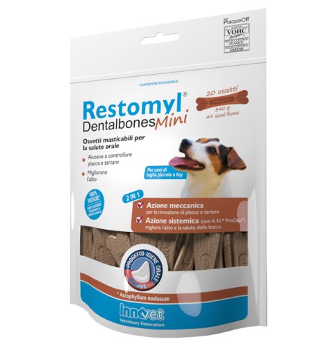 Restomyl Dentalbones Mini può essere somministrato alternato a Restomyl Supplemento o Restomyl Dentalcroc come “premio” di salute orale.